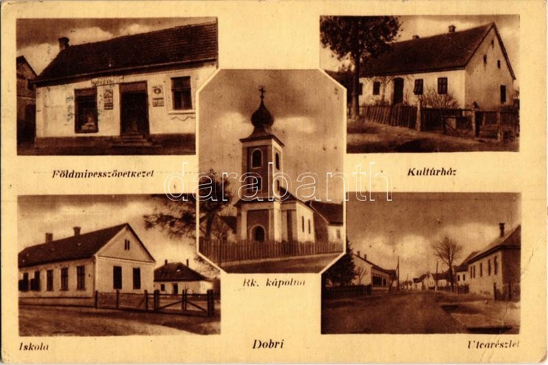 Dobri, Földmívesszövetkezet üzlete, Kultúrház, Római katolikus kápolna... https://www.darabanth.com/de/344-Fernauktion/344.0/Ansichtskarten/Ungarn~1500004/Dobri-Foldmivesszovetkezet-uzlete-Kulturhaz-Romai-katolikus-kapolna-Iskola-utcakep-EB~II1941534