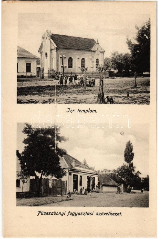 Beschreibung: Füzesabony, Izraelita templom, zsinagóga, Füzesabonyi Fogyasztási Szövetkezet üzlete (leporellóból, középen vágás)