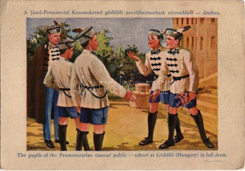 A Jászó-Premontrei kanonokrend gödöllői nevelőintézetének növendékei díszben. Kiadja a Trunkhahn posztógyár és ruhagyár rt. / students of the Premontrarian canon's public school in Gödöllő. Hungarian clothing factory advertisement card s: Márton L. (EK)