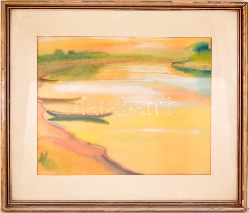 Beschreibung: Gáborjáni Szabó Kálmán (1897-1955): Csónak a Tiszán, akvarell, papír, jelzett, paszpartuban, üvegezett fa keretben, 35×43,5 cm