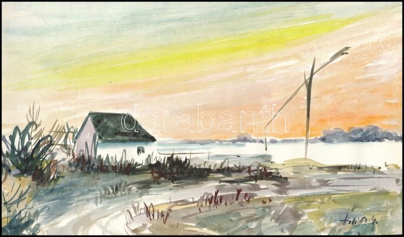 Beschreibung: Holló jelzéssel: Kunyhó gémeskúttal. Akvarell, papír, 17×30 cm