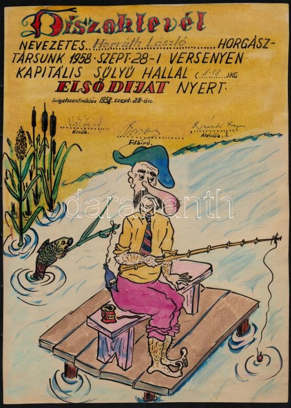 Jelzés nélkül: 1958 Díszoklevél horgásztársnak. Vegyes technika, papír... https://www.darabanth.com/de/344-Fernauktion/344.0/Gemalde-und-Grafiken/Gemalde-und-Grafiken~2/Jelzes-nelkul-1958-Diszoklevel-horgasztarsnak-Vegyes-technika-papir-35C39725-cm~II1950998