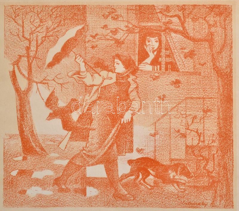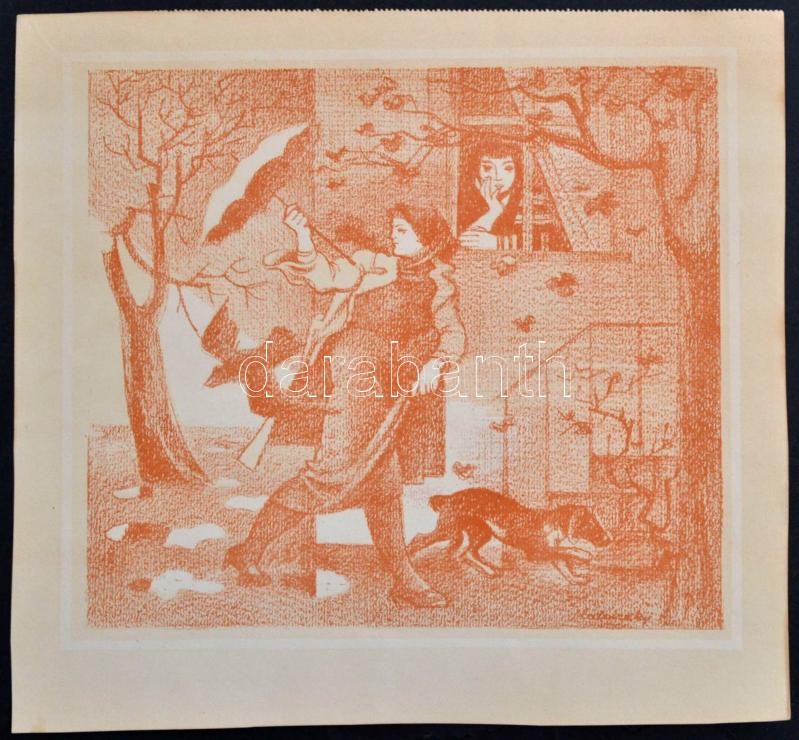 Beschreibung: Medveczky Jenő (1902-1969): Esőben. Litográfia, papír, jelzett a litón, 20×23 cm