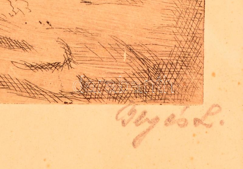 Beschreibung: Olvashatatlan jelzéssel: Lovasszán. Rézkarc, papír, üvegezett sérült keretben, 17×24 cm