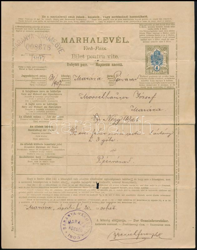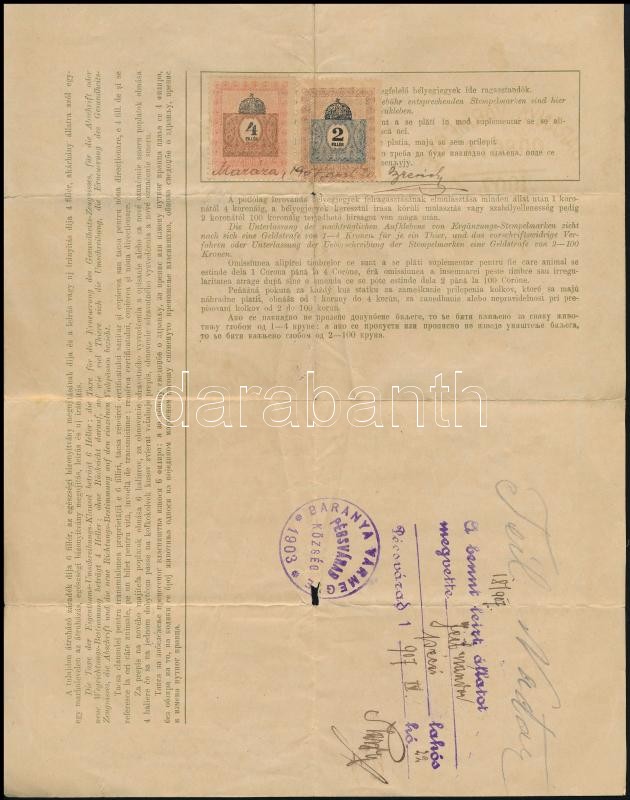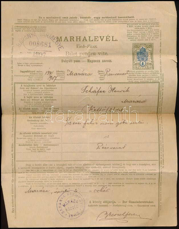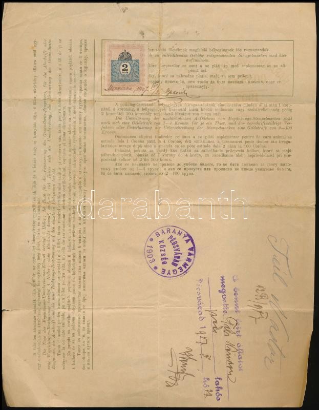 1907 Máraháza 2 db marhalevél 2p és 3p okmánybélyeg kiegészítéssel https://www.darabanth.com/de/344-Fernauktion/344.0/Kunst-Dokumente-andere-Sammelgebiete/Dokument~19/1907-Marahaza-2-db-marhalevel-2p-es-3p-okmanybelyeg-kiegeszitessel~II1949722