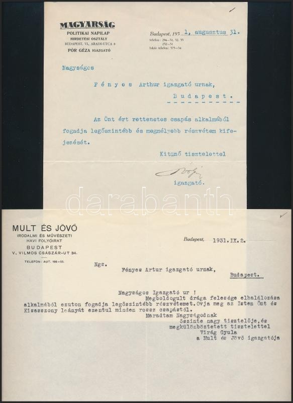 1928-1931 Újságok fejléces levélpapírjaira írt levelek (Magyarság, Múl... https://www.darabanth.com/de/344-Fernauktion/344.0/Kunst-Dokumente-andere-Sammelgebiete/Dokument~19/1928-1931-Ujsagok-fejleces-levelpapirjaira-irt-levelek-Magyarsag-Mult-es-Jovo-Kunstad~II1947124