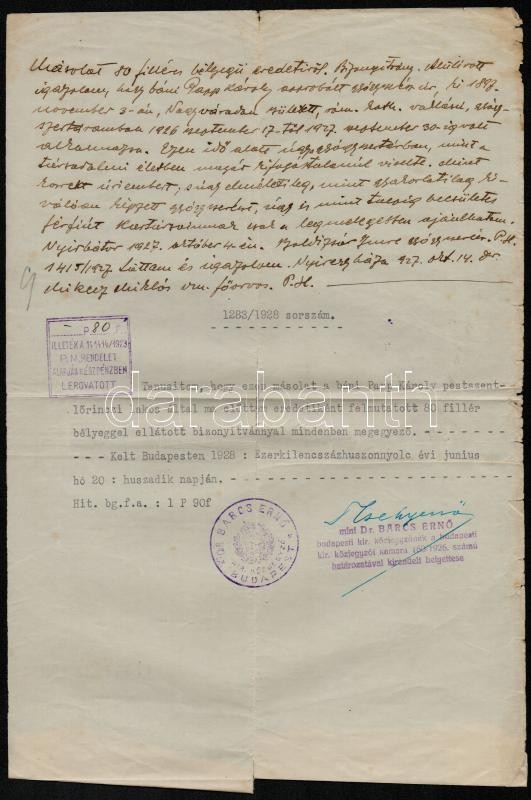 1928 Hivatalos másolat 80f készpénzlerovás pecséttel https://www.darabanth.com/de/344-Fernauktion/344.0/Kunst-Dokumente-andere-Sammelgebiete/Dokument~19/1928-Hivatalos-masolat-80f-keszpenzlerovas-pecsettel~II1949724