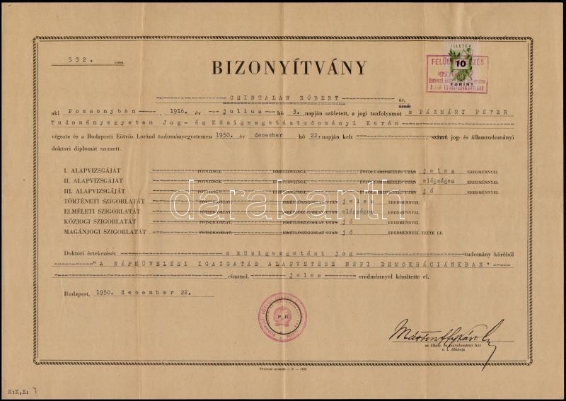 Beschreibung: 1950 a Pázmány Péter Tudományegyetem Jog- és Közigazgatástudományi Karának doktori bizonyítványa, okmánybélyeggel