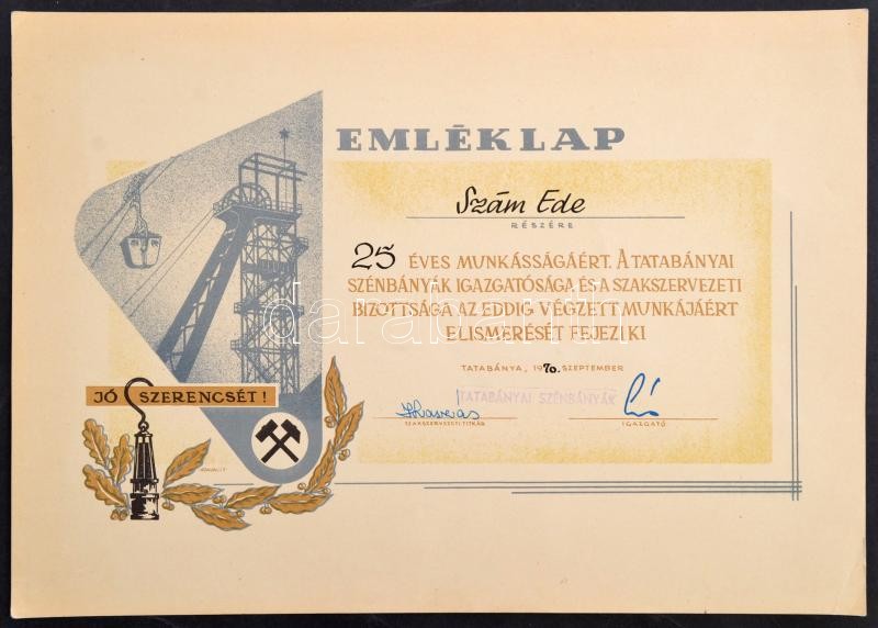 1970 A Tatabányai Szénbányák díszes emléklapja 25 éves munkásság alkal... https://www.darabanth.com/de/344-Fernauktion/344.0/Kunst-Dokumente-andere-Sammelgebiete/Dokument~19/1970-A-Tatabanyai-Szenbanyak-diszes-emleklapja-25-eves-munkassag-alkalmabol~II1941077