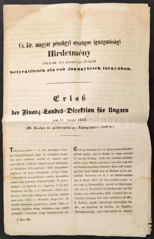 1852 Hirdetmény a bélyegilleték tárgyában magyar és német nyelven / An... https://www.darabanth.com/de/344-Fernauktion/344.0/Kunst-Dokumente-andere-Sammelgebiete/Drucksachen~31/1852-Hirdetmeny-a-belyegilletek-targyaban-magyar-es-nemet-nyelven-Announcement-about-the-st~II1940587