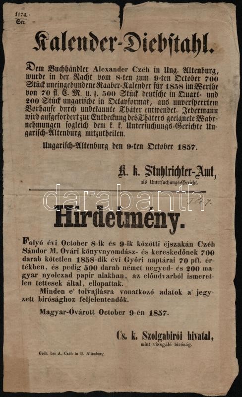 Beschreibung: 1857 Magyaróvár, Cs. k. szolgabírói hivatal hirdetménye Czéh Sándor könyvnyomdász tulajdonának ellopásáról magyar és német nyelven