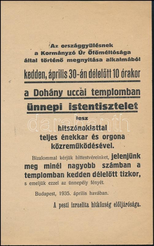 1935 Bp., A pesti izraelita hitközség szórólapja az országgyűlés megny... https://www.darabanth.com/de/344-Fernauktion/344.0/Kunst-Dokumente-andere-Sammelgebiete/Drucksachen~31/1935-Bp-A-pesti-izraelita-hitkozseg-szorolapja-az-orszaggyules-megnyitasa-alkalmabol-ren~II1950838