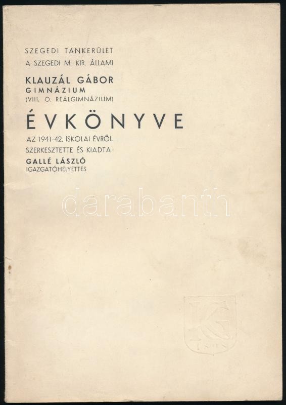 1942 A szegedi Klauzál Gábor gimn évkönyve. 66p. https://www.darabanth.com/de/344-Fernauktion/344.0/Kunst-Dokumente-andere-Sammelgebiete/Drucksachen~31/1942-A-szegedi-Klauzal-Gabor-gimn-evkonyve-66p~II1949653