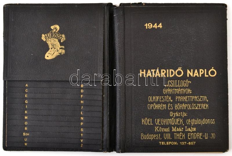 1944 Csillogó festékek reklámos határidőnapló és regiszteres telefonkö... https://www.darabanth.com/de/344-Fernauktion/344.0/Kunst-Dokumente-andere-Sammelgebiete/Drucksachen~31/1944-Csillogo-festekek-reklamos-hataridonaplo-es-regiszteres-telefonkonyv~II1918176