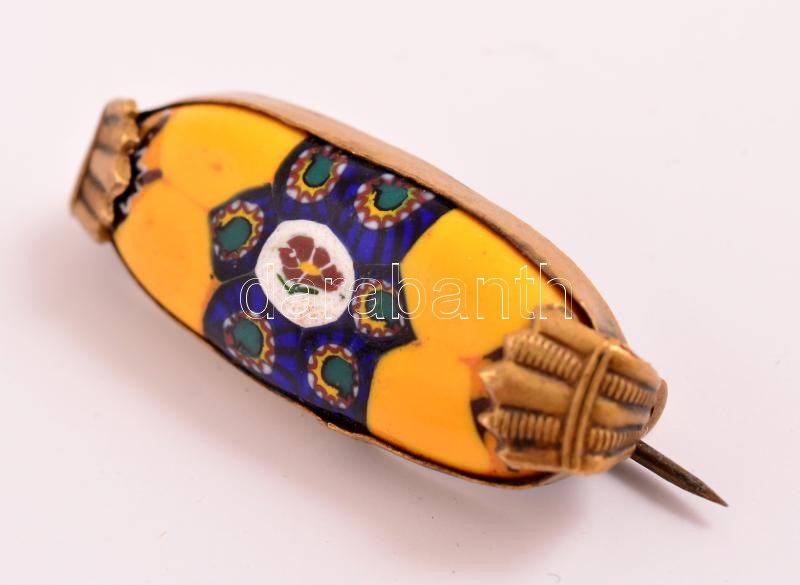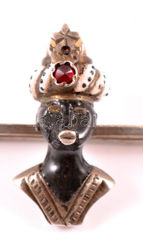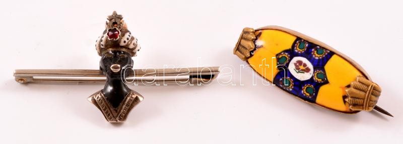 Beschreibung: 2 db kitűző, egyiken turbános fej, a másikon zománcozott díszítéssel, h: 3,5 és 4,5 cm