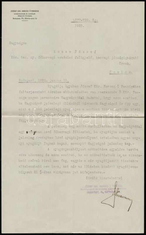 1923 József főherceg intézőjének levele Kokas József főhercegi intézőnek