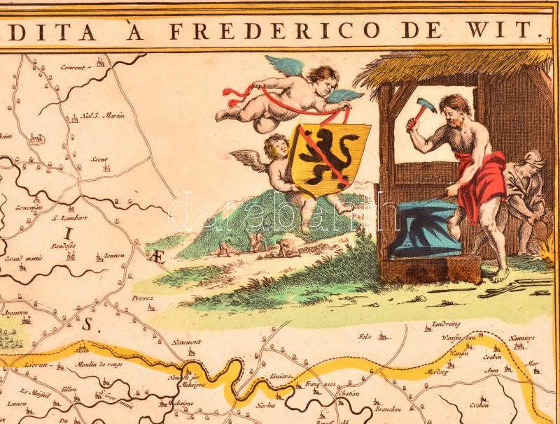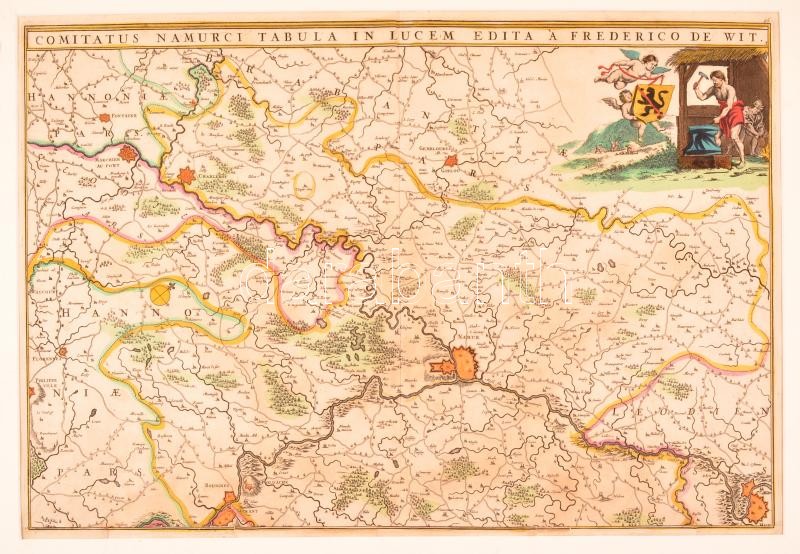 1680 Frederick de Wit (1629/1630-1706): Comitatus Namurci Tabula In Lucem, Namur megye térképe. Kézzel színezett rézmetszet. Körbevágott, az alsó szélén hiánnyal, restaurált, paszpartuban, 37x55 cm./ 1680 Frederick de Wit (1629/1630-1706): Comitatus Namurci Tabula In Lucem, hand colored copper engraving. With lack on the bottom, restored, in passepartout, 37x55 cm.