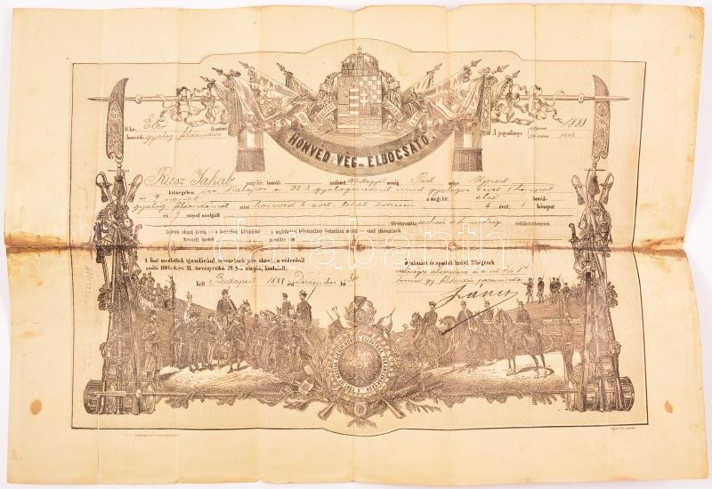 1888 Honvéd végelbocsájtó levél. Hajtásoknál ragasztott 50x38 cm https://www.darabanth.com/de/344-Fernauktion/344.0/Kunst-Dokumente-andere-Sammelgebiete/Militaria~29/1888-Honved-vegelbocsajto-level-Hajtasoknal-ragasztott-50x38-cm~II1952920