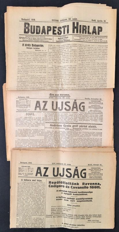 1916-1920 Az Ujság 2 száma: 1916. feb. 14. XIV. évf. 45. sz., 1920. dec. 29. XVIII. évf. 305. sz. + Budapesti Hírlap 1918. ápr. 16. XXXVIII. évf. 90 sz., 8+6+12 p. Közte szakadozottak, foltosak. Benne a kor híreivel, korabeli reklámokkal. Az 1918-as számban a király budapesti látogatásával.
