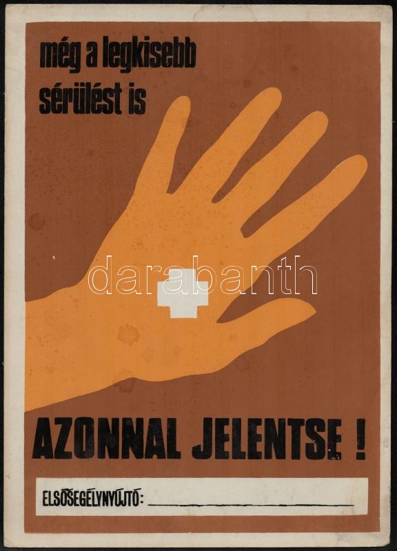 Még a legkisebb sérülést is azonnal jelentse. Balesetvédelmi plakát. 3... https://www.darabanth.com/de/344-Fernauktion/344.0/Kunst-Dokumente-andere-Sammelgebiete/Plakat~7/Meg-a-legkisebb-serulest-is-azonnal-jelentse-Balesetvedelmi-plakat-35x25-cm-Kartonon~II1942507