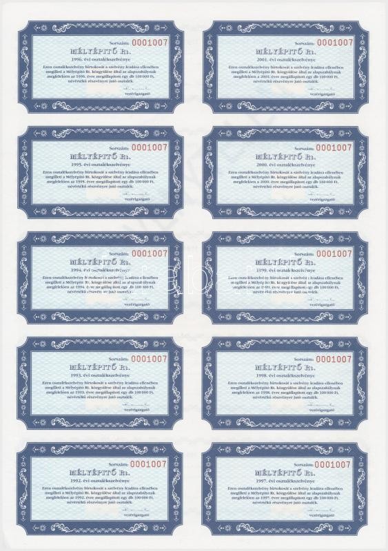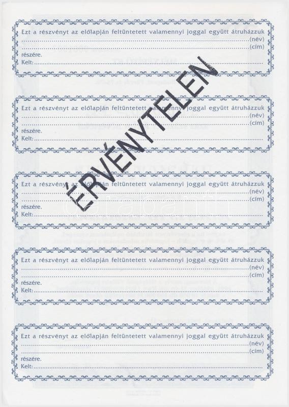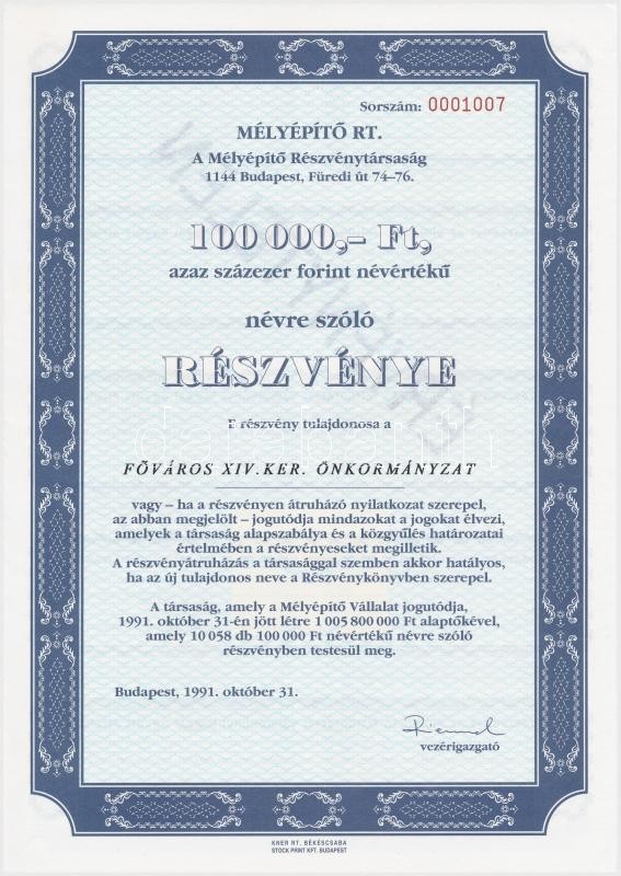 Budapest 1991. "Mélyépítő RT. " névre szóló részvénye 100.00... https://www.darabanth.com/de/344-Fernauktion/344.0/Numismatik/Aktien-und-Tickets~1000005/Budapest-1991-Melyepito-RT-nevre-szolo-reszvenye-100000Ft-rol-szelvenyekkel-belsC5~II1918993