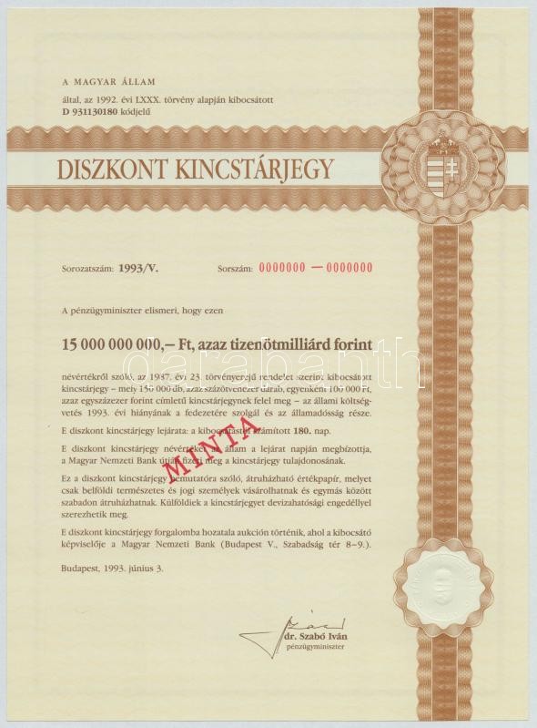 Beschreibung: Budapest 1993. "Diszkont Kincstárjegy" százötvenezer 100.000Ft névértékű kincstárjegy egyben, összesen 15.000.000.000Ft-ról, szárazpecséttel, "MINTA" felülbélyegzéssel és "0000000"-ás sorszámmal T:I