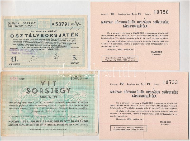 1939. "41. Magyar Királyi Osztálysorsjáték" egynegyed, ötödik osztályú sorsjegye, az elárusítóhely bélyegzőjével + 1957. "VIT SORSJEGY" 3Ft-ról + 1962. "Magyar Bélyeggyűjtők Országos Szövetsége Tárgysorsjátéka" 4Ft-ról (2x) T:II-III egyik ragasztott