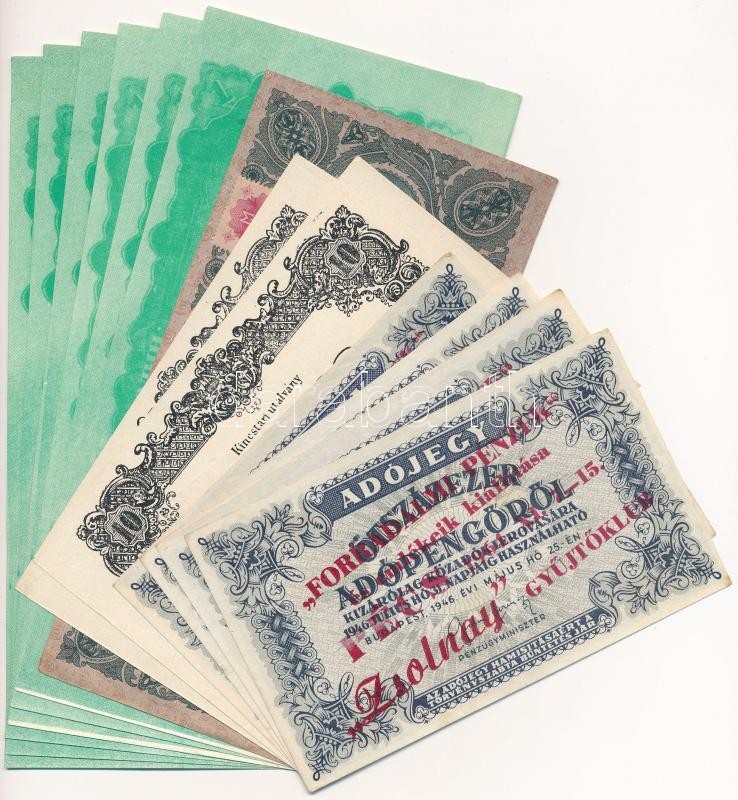 13db-os pengő és bankjegy utánnyomat tétel, benne 1849. 10Ft "Kincstári utalvány" 1964-es utánnyomata "Forradalmi Pénzek és emlékeik kiállítása Pécs 1964. XI. 7-15. Zsolnay Gyűjtőklub" valamint Szovjetunió 1937. 1 Chervonetz "Szovjet-Lenin Pénzek kiállítása Pécsett 1967. XI. 4-8. Nagy Lajos Gimnáziumban" fekete felülbélyegzéssel T:I-II-