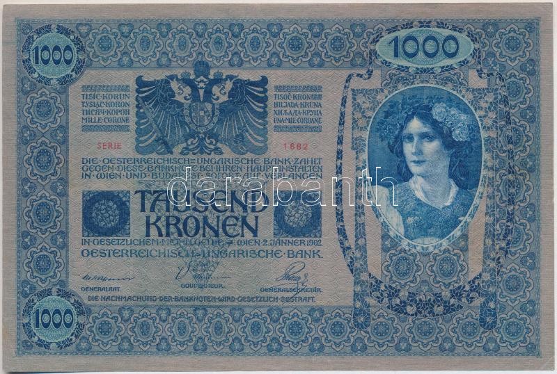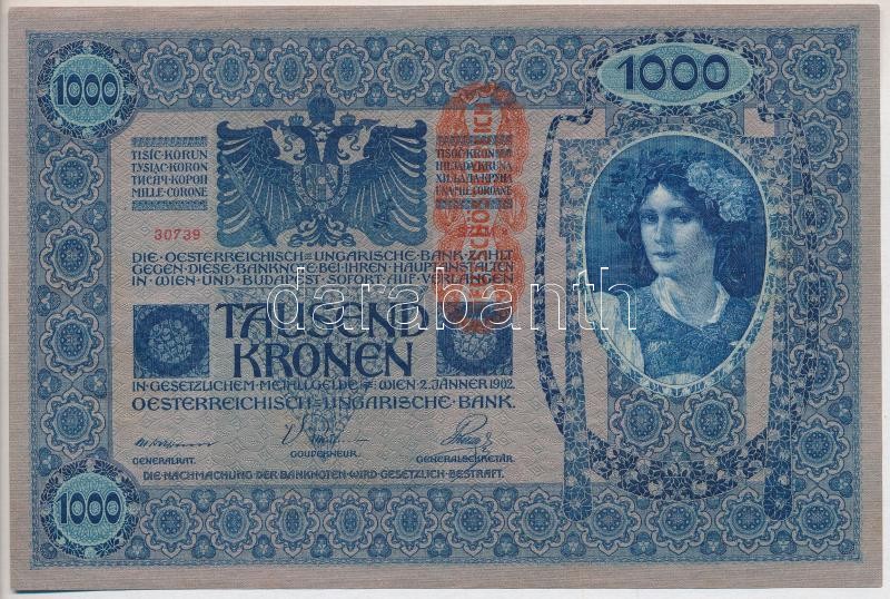 1902. 1000K függőleges "Deutschösterreich" felülbélyegzéssel... https://www.darabanth.com/de/344-Fernauktion/344.0/Numismatik/Ungarische-Banknoten~1000007/1902-1000K-fuggoleges-Deutschosterreich-felulbelyegzessel-mindket-oldala-nemet-TI-I-~II1945382
