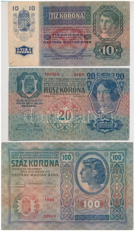 1912. 100K + 1913. 20K + 1915. 10K T:III https://www.darabanth.com/de/344-Fernauktion/344.0/Numismatik/Ungarische-Banknoten~1000007/1912-100K-plus-1913-20K-plus-1915-10K-TIII~II1953310