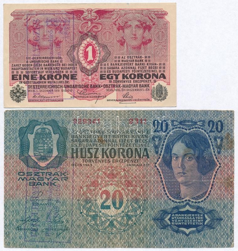 1913. 20K + 1916. 1K mindkettő hamis felülbélyegzéssel (fake overprint... https://www.darabanth.com/de/344-Fernauktion/344.0/Numismatik/Ungarische-Banknoten~1000007/1913-20K-plus-1916-1K-mindketto-hamis-felulbelyegzessel-fake-overprint-TIII~II1941015