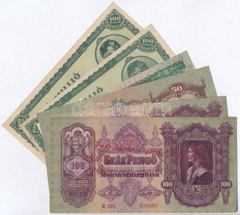 Beschreibung: 1930. 100P (2x) + 1932. 50P + 1936. 10P + 1946. 100.000.000MP mind "Forradalmi Pénzkiállítás Pécsett 1968. III. 13-14." felülbélyegzéssel T:II-III