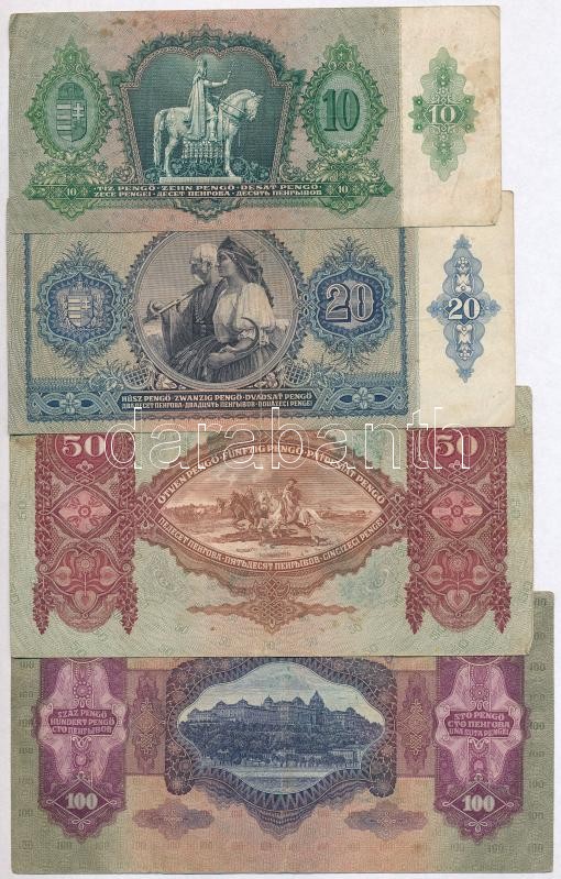 Beschreibung: 1930. 100P + 1932. 50P + 1936. 10P + 1941. 20P mindegyik hamis nyilaskeresztes ráfestéssel (fake overprint) T:III