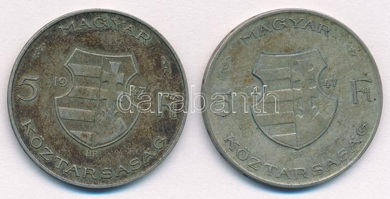 1947. 5Ft Ag "Kossuth" (2x) T:2-,3 patina https://www.darabanth.com/de/344-Fernauktion/344.0/Numismatik/Ungarische-Munzen-und-Munzen-mit-ungarischem-Munzzeichen~1000008/1947-5Ft-Ag-Kossuth-2x-T2-3-patina~II1941063