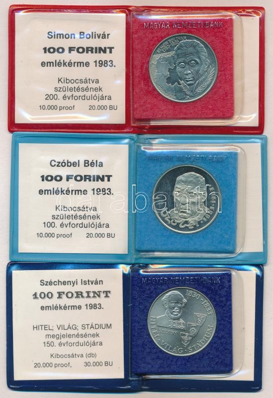 Beschreibung: 1983. 100Ft alpakka "Simon Bolivár" + 1983. 100Ft alpakka "Czóbel Béla" + 1983. 100Ft alpakka "Széchenyi István" mindegyik eredeti tokban, tanúsítvánnyal T:BU,PP