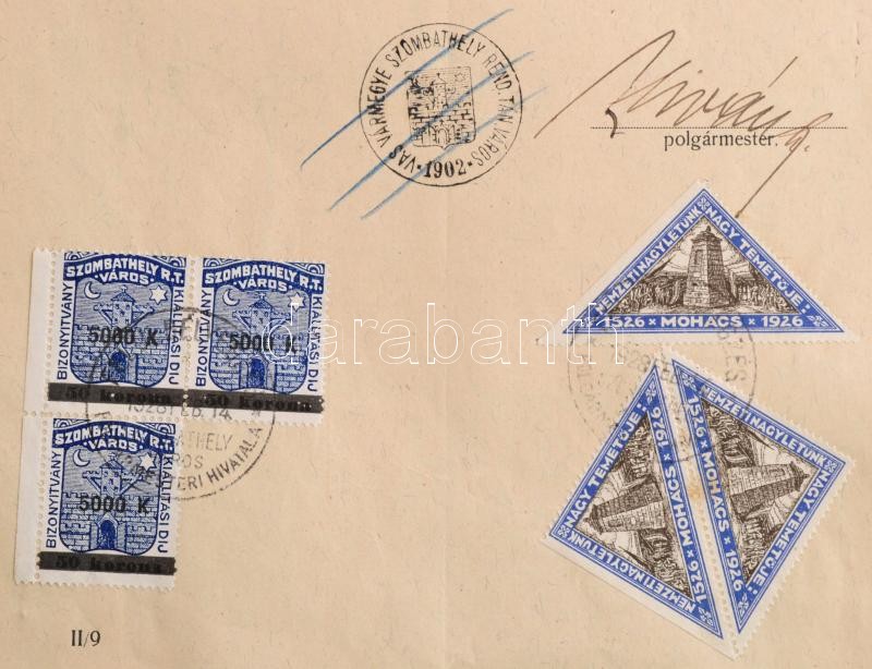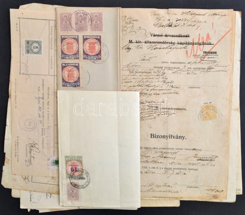 Beschreibung: Városi illetékbélyegek okmányokon. Összesen 12 db okmány, Ujpest, Szeged, Győr, Karcag, Szombathely + 2 osztrák és csehszlovák.