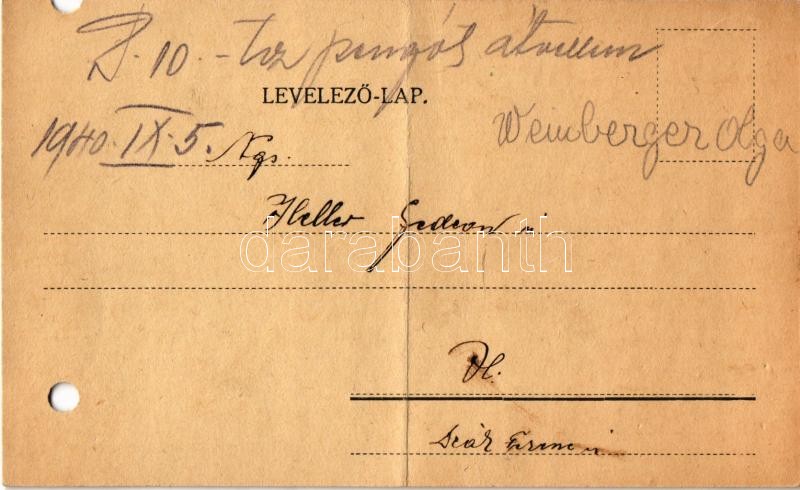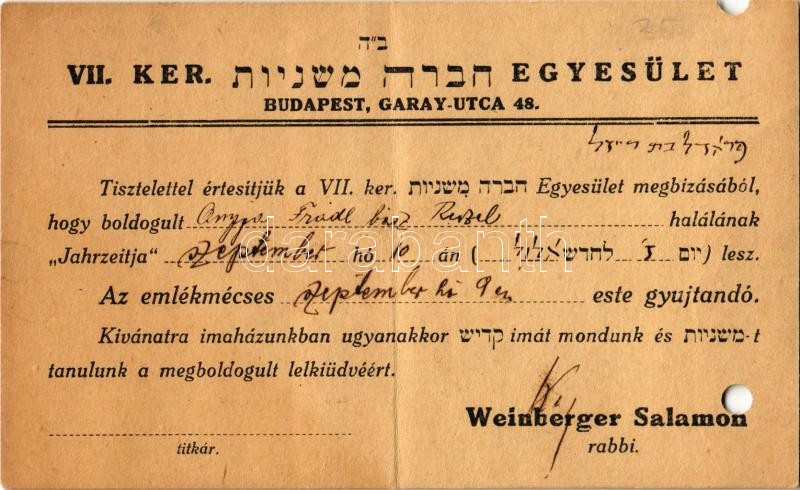 VII. Ker. Budapest, Garay utca 48. (később Magyar Zsidó Kulturális Egyesület). Weinberger Salamon rabbi héber-magyar nyelvű meghívója halálozási évfordulóra (Jahrzeit / Jorcajt) / Invitation of a Bereavement from a Hungarian rabbi. Hebrew-Hungarian Judaica (lyukasztott / punched holes)