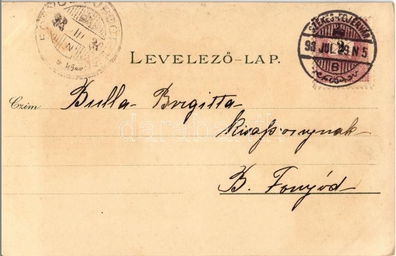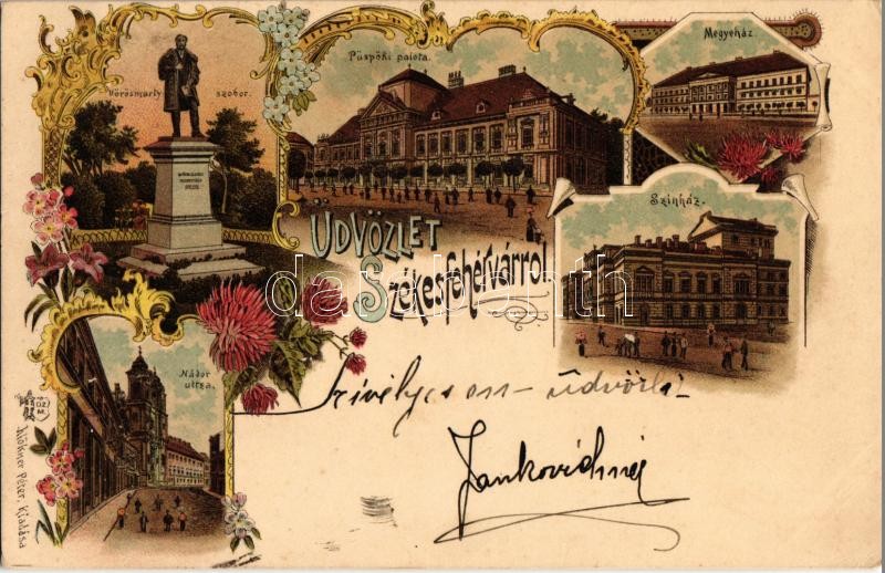 Beschreibung: 1898 (Vorläufer!) Székesfehérvár, Vörösmarty szobor, püspöki palota, Megyeház, Színház, Nádor utca. Klökner Péter kiadása, floral, Art Nouveau, litho