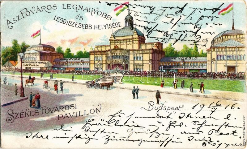 Beschreibung: 1916 Budapest XIV. Városliget, Székesfővárosi Pavilon, Bokor János vendéglője, étterem, Weingruber Ignác kávéháza, kerékpárosok, hintó. Kosmos litho (kopott sarok / worn corner)