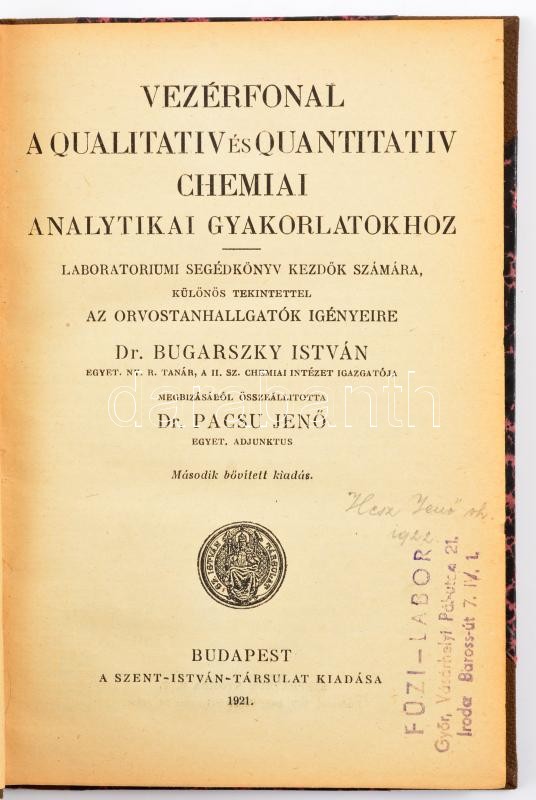 Pacsu Jenő: Vezérfonal a qualitativ és quantitativ chemiai analytikai gyakorlatokhoz. Laboratoriumi segédkönyv kezdők számára. Bp., 1921, Szent István Társulat. Későbbi félvászon kötésben, jó állapotban.