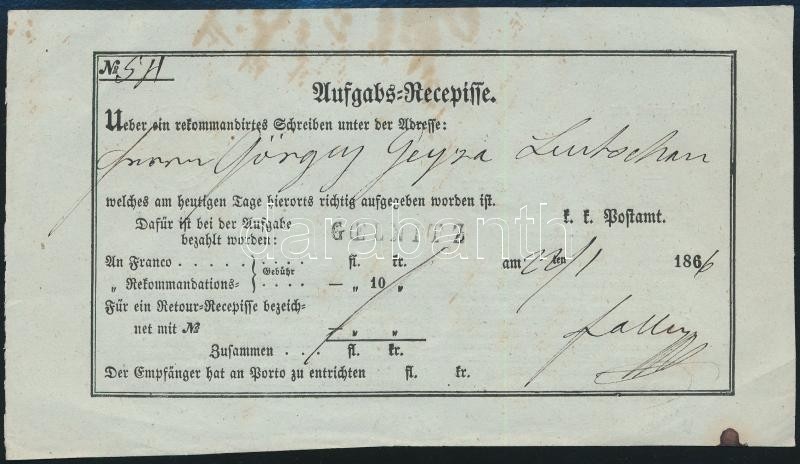 Beschreibung: 1866 Gölnicből (Felvidék) Lőcsére (Leutschau) feladott ajánlott levél feladóvevénye kitöltve