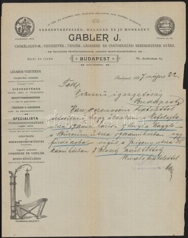 1897 Bp., Gabler J. Csőhálózatok-, Vízvezeték stb. Gyárának fejléces l... https://www.darabanth.com/de/345-Fernauktion/345.0/Kunst-Dokumente-andere-Sammelgebiete/Dokument~500018/1897-Bp-Gabler-J-Csohalozatok-Vizvezetek-stb-Gyaranak-fejleces-levelpapirjara-irt-~II1957138