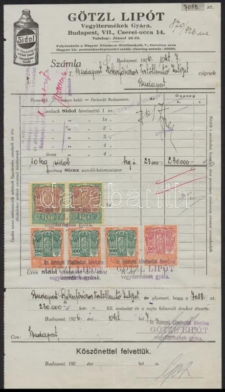 1926 Bp., Götzl Lipót Vegyitermékek Gyára fejléces számla okmánybélyeg... https://www.darabanth.com/de/345-Fernauktion/345.0/Kunst-Dokumente-andere-Sammelgebiete/Dokument~500018/1926-Bp-Gotzl-Lipot-Vegyitermekek-Gyara-fejleces-szamla-okmanybelyegekkel~II1957119