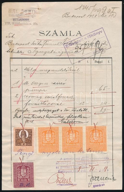 Beschreibung: 1928 Bp., Gál Ármin gépészmérnök számlája okmánybélyegekkel
