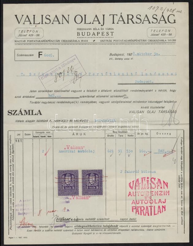 1928 Bp., Valisan Olaj Társaság fejléces számlája okmánybélyegekkel https://www.darabanth.com/de/345-Fernauktion/345.0/Kunst-Dokumente-andere-Sammelgebiete/Dokument~500018/1928-Bp-Valisan-Olaj-Tarsasag-fejleces-szamlaja-okmanybelyegekkel~II1957054
