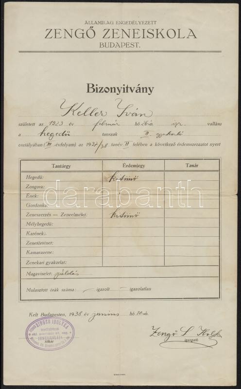 1938 Bp., A Zengő Zeneiskola bizonyítványa https://www.darabanth.com/de/345-Fernauktion/345.0/Kunst-Dokumente-andere-Sammelgebiete/Dokument~500018/1938-Bp-A-Zengo-Zeneiskola-bizonyitvanya~II1956626
