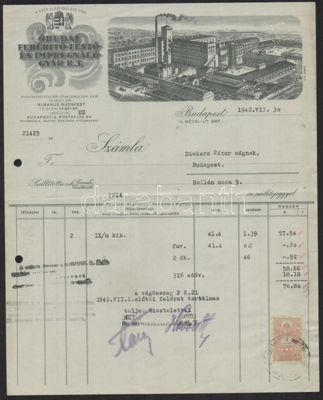 1942 Bp., Óbudai Fehérítő- és Impregnáló Gyár Rt. fejléces számlája, r... https://www.darabanth.com/de/345-Fernauktion/345.0/Kunst-Dokumente-andere-Sammelgebiete/Dokument~500018/1942-Bp-Obudai-Feherito-es-Impregnalo-Gyar-Rt-fejleces-szamlaja-rajta-a-gyar-kepe~II1957309