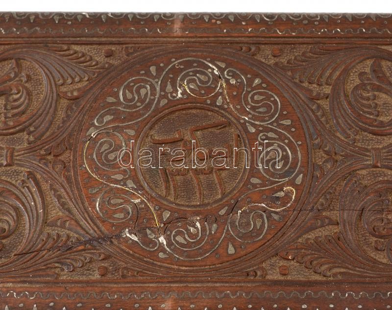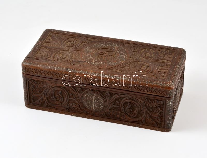 Beschreibung: 1916 Díszesen faragott fa díszdoboz, "Üsküb" felirattal, fedelén repedéssel, sérülésekkel, 23×11×8 cm