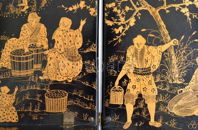 Beschreibung: Összecsukható lakkozott sarokpolc, távol-keleti mintával, karton, m: 37 cm