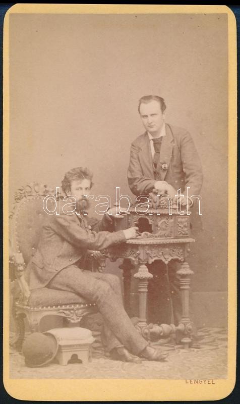 Endrődi Sándor (1850-1920) költő, író és Nagy Imre (1849-1893) színművész, rendező, a Színiakadémia tanára. Lengyel Samu (Balatonfüred) képe. 1870 körül. 6x10 cm